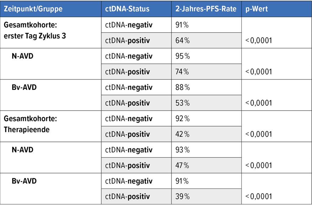 Tab. 1: Progressionsfreies Überleben (PFS) in Abhängigkeit von der zirkulierenden Tumor-DNA (ctDNA) in der Gesamtkohorte und den beiden Therapiearmen der SWOG-S1826-Studie (modifiziert nach Herrera AF et al.)11