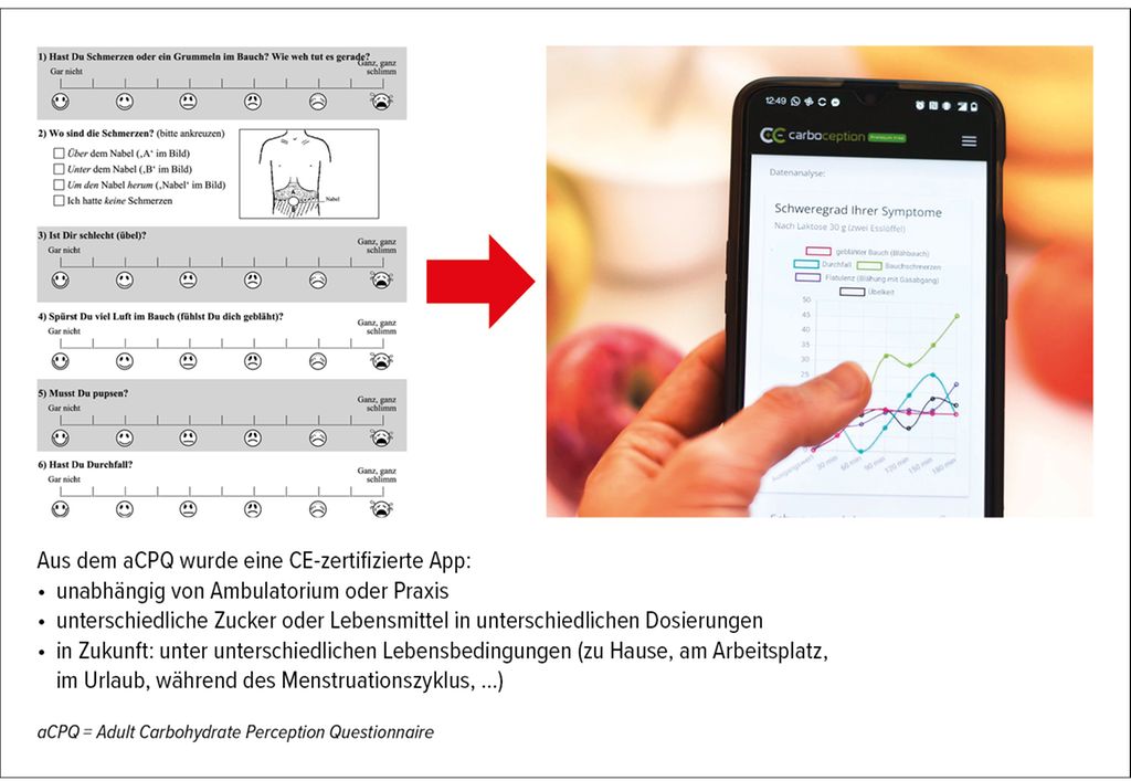 Der aCPQ wurde in ein elektronisches Format als CE-zertifizierte App («Carboception») übergeführt (Abb. 1). Durch die Anwendung können Ärzt:innen und Diätolog:innen folgende Fragestellungen klären: