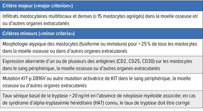 Conformément à la classification 2022 de l’OMS, il existe un critère majeur et quatre critères mineurs pour le diagnostic de la MS,4 qui sont présentés dans le Tableau1. Comme l’expression de CD30 par les mastocytes est associée à la MS, elle a été ajoutée au critère mineur correspondant. En outre, la présence d’une autre mutation activatrice de KIT (pas exclusivement la mutation KIT-p.D816V) a été reconnue comme critère mineur. Le diagnostic de la MS peut être posé si le critère majeur et au moins un critère mineur ou au moins trois critères mineurs sont remplis.