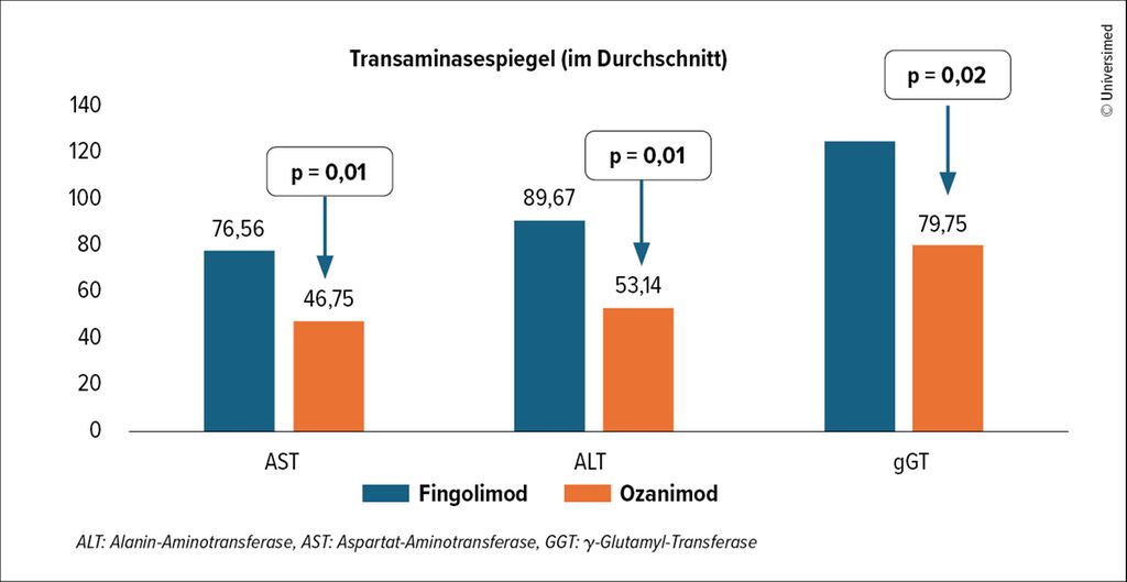 Nach der Umstellung von Fingolimod auf Ozanimod stieg der Lymphozytspiegel bei den Patient:innen mit zuvor diagnostizierter Lymphopenie im Durchschnitt von 0,39 (SD=0,24) auf 0,56 (SD=0,23; p=0,025). Die Leberwerte, erhoben anhand der Blutparameter Alanin-Aminotransferase (AST), Aspartat-Aminotransferase (ALT) und γ-Glutamyl-Transferase (gGT) verbesserten sich ebenfalls (Abb. 1). Bei Patient:innen mit zuvor erhöhten Leberwerten ging der AST-Spiegel von 76,56 auf 46,75 (p=0,01), der ALT-Spiegel von 89,67 auf 53,14 (p=0,01) und der gGT-Spiegel von 124,22 auf 79,75 (p=0,02) zurück. Der Anteil der Patient:innen mit erhöhten Leberwerten sank von 21,6% auf 9,3%.
