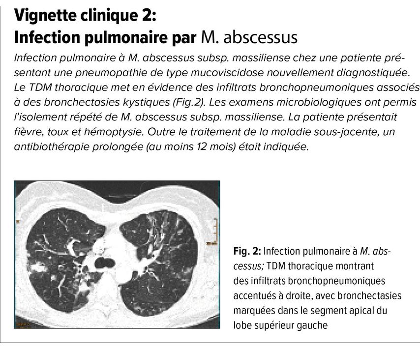 Le traitement de M. abscessus est long, difficile et souvent décevant. Il doit donc être conduit en collaboration avec un centre spécialisé. Le schéma repose généralement sur deux phases: une phase initiale intensive suivie d’une phase d’entretien. Une résection chirurgicale peut être envisagée en cas de lésions localisées.
