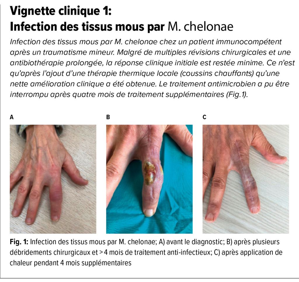 En cas d’infection cutanée ou des tissus mous par des mycobactéries thermosensibles, une thérapie locale par chaleur peut être envisagée. Cette méthode thérapeutique, décrite dans des séries de cas, exploite la propriété microbiologique de certaines mycobactéries de pas se multiplier au-delà de 37°C. L’application locale de chaleur (p.ex. coussins chauffants) peut ainsi contribuer de manière significative à la réponse thérapeutique (voir vignette clinique 1).