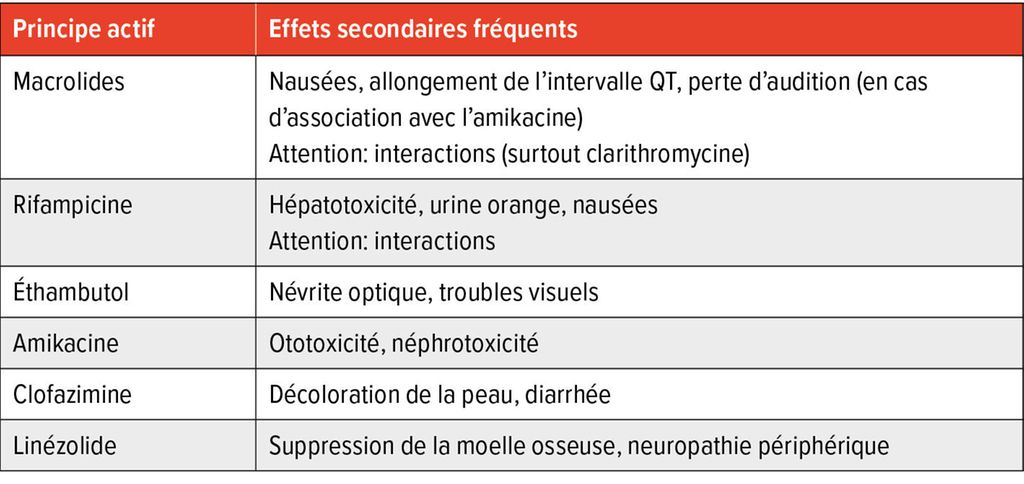 Les options mentionnées dans les recommandations ATS/ERS/ESCMID/IDSA (céfoxitine, tédizolide, omadacycline) ne sont pas disponibles en Suisse et n’ont donc pas, à ce jour, de rôle pratique en clinique courante.