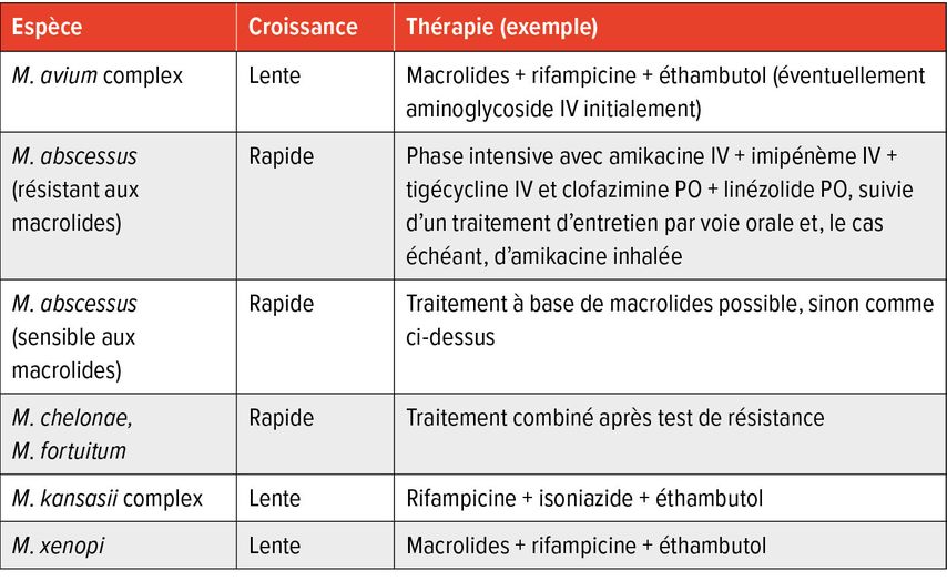 Les traitements sont longs et guidés par les résultats des tests de sensibilité in vitro. En cas d’infection pulmonaire, un traitement ≥12 mois après négativation des cultures est généralement recommandé. Pour les infections des tissus mous traités chirurgicalement, une antibiothérapie prolongée sur plusieurs mois est également indiquée. Le choix optimal des molécules et leur mode l’administration (par voie intraveineuse, orale ou inhalée; quotidienne ou intermittente) dépendent de l’espèce, des manifestations et de la sévérité de la maladie. Les recommandations thérapeutiques des infections pulmonaires à MNT s’appuient sur les guidelines ATS/ERS/ESCMID/IDSA. Pour les formes extrapulmonaires, les décisions reposent souvent sur l’avis d’experts, faute de recommandations thérapeutiques claires. La prévention de l’émergence de résistances, notamment aux macrolides, constitue une priorité. C’est pourquoi les monothérapies sont à proscrire.