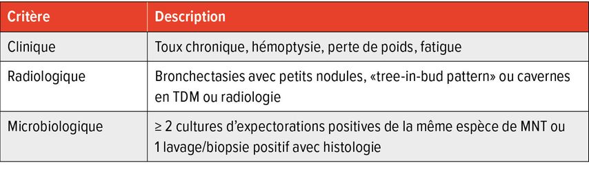 Selon les critères IDSA/ATS, le diagnostic d’une maladie pulmonaire à MNT repose sur l’association de symptômes cliniques (éventuellement en plus d’une maladie sous-jacente), d’anomalies radiologiques typiques et d’une confirmation microbiologique (Tab.1). Il est crucial de distinguer maladie par MNT, colonisation et infection transitoire, car les MNT peuvent être isolées fortuitement chez des patient·es asymptomatiques. Une détection respiratoire répétée rend improbable une clairance spontanée. Le diagnostic ne conduit pas systématiquement à un traitement: la décision dépend de la progression, du risque d’effets indésirables et des interactions. Ces incertitudes doivent être expliquées aux patient·s; la décision pour ou contre un traitement relève d’une démarche de «décision partagée».