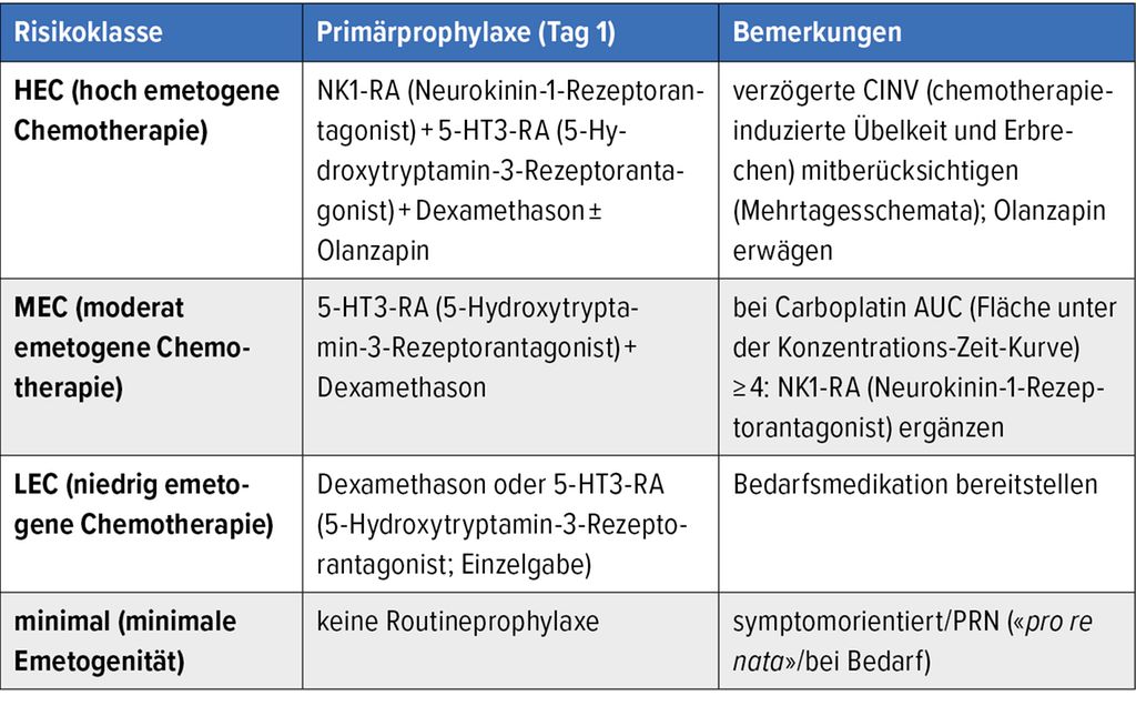Die Primärprophylaxe bei Emesis und Nausea richtet sich nach patient:innenspezifischen Faktoren und der emetogenen Risikoklasse des Regimes. Es werden vier Klassen unterteilt: