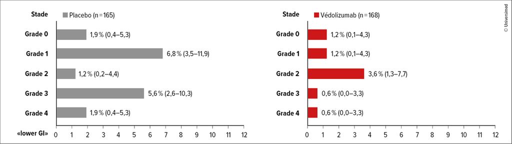 Fig.1: Taux d’aGVHD «lower GI» dans le bras sous placebo et dans celui sous védolizumab, selon le stade clinique maximal5