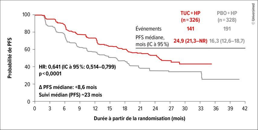 Fig.1: Survie sans progression (PFS) sous tucatinib plus trastuzumab et pertuzumab versus placebo plus trastuzumab et pertuzumab (modifiée selon Hamilton E)1