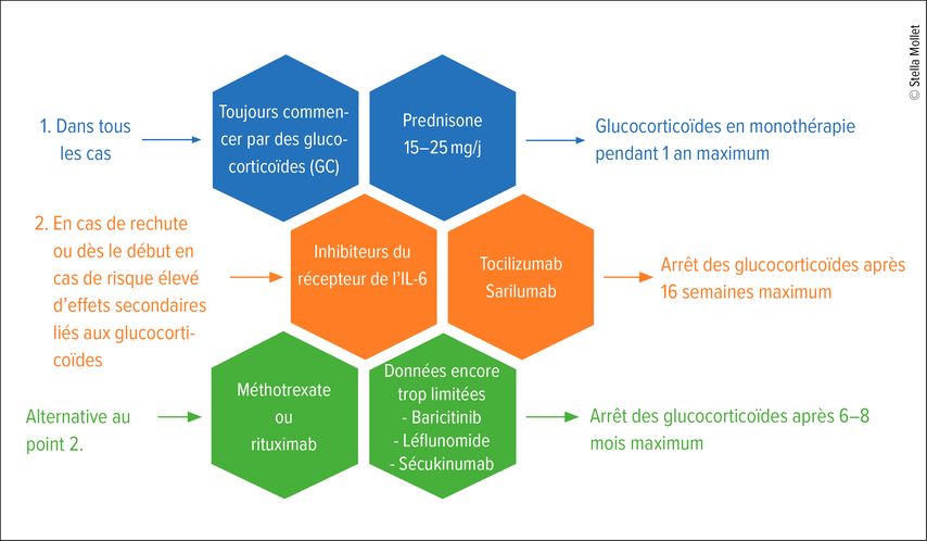 La modification la plus significative des directives 2024 est la recommandation de l’initiation d’une biothérapie par un antagoniste du récepteur de l’interleukine (IL-)6 en cas de récidive ou de risque élevé d’effets secondaires liés aux glucocorticoïdes. Grâce à de nouvelles études avec un haut niveau de preuve, ces traitements sont même privilégiés au méthotrexate.