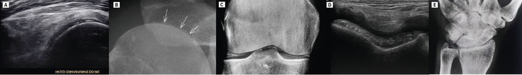 Fig.1: Radiographies et échographies de patients présentant une CPPD en tant que diagnostic différentiel principal de la polymyalgie rhumatismale. Calcifications au niveau du cartilage hyalin de la tête humérale à l’échographie (A) et à la radiographie (B); calcifications au niveau du cartilage hyalin du fémur ainsi que du fibrocartilage du ménisque à la radiographie (C) et du cartilage hyalin du fémur à l’échographie (D); calcifications au niveau du TFCC à la radiographie (E)