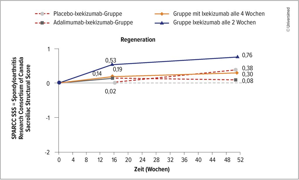 Rezente Daten legen auch nahe, dass bei frühem Therapiebeginn im MRT sichtbare Erosionen reversibel sind. So zeigen Analysen einer Studie mit Ixekizumab, dass es bereits zu Woche 16 zu einem „Auffüllen“ von Erosionen kommt, das über 52 Wochen zunimmt (Abb.1).11 Auch Adalimumab modifiziert strukturelle Läsionen, sofern sie nur mit MRT, nicht jedoch im Röntgen sichtbar sind.11 Marzo-Ortega betont, dass es lange Zeit benötigt, bis die irreversiblen Schäden am Knochen eintreten, die im Röntgen dargestellt werden können. Ähnliches sei bereits vor Jahren für die rheumatoide Arthritis gezeigt worden, so Marzo-Ortega.