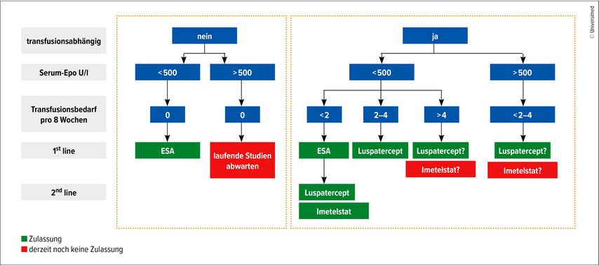 Bei der Wahl des therapeutischen Agens ist zunächst die Zulassung zu bedenken: Abgesehen von Epo (für symptomatische Anämie mit Hb ≤10g/dl) ist in allen Fällen ein Transfusionsbedarf für den Therapiebeginn erforderlich. Zur weiteren Auswahl sollte aufgrund der herausragenden Ergebnisse bei MDS mit isolierter del(5q)-Deletion Lenalidomid zur Anwendung kommen. Für alle anderen Entitäten bietet sich Epo (falls Response erwartbar nach Nordic Score) oder belegt durch die Daten der COMMANDS-Studie Luspatercept als Erstlinientherapie an.
