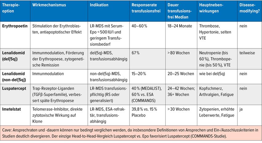 Epo, Transfusionen, Eisenchelation, in spezifischen Konstellationen Lenalidomid und Immunsuppressive Therapie sind langbewährte Therapieoptionen.