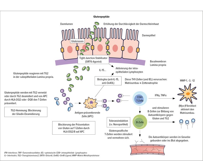 Abb. 1: Pathogenese der Zöliakie im Dünndarm und Ansätze für pharmakologische Therapieoptionen (modifiziert nach Schuppan D et al. 2025)2