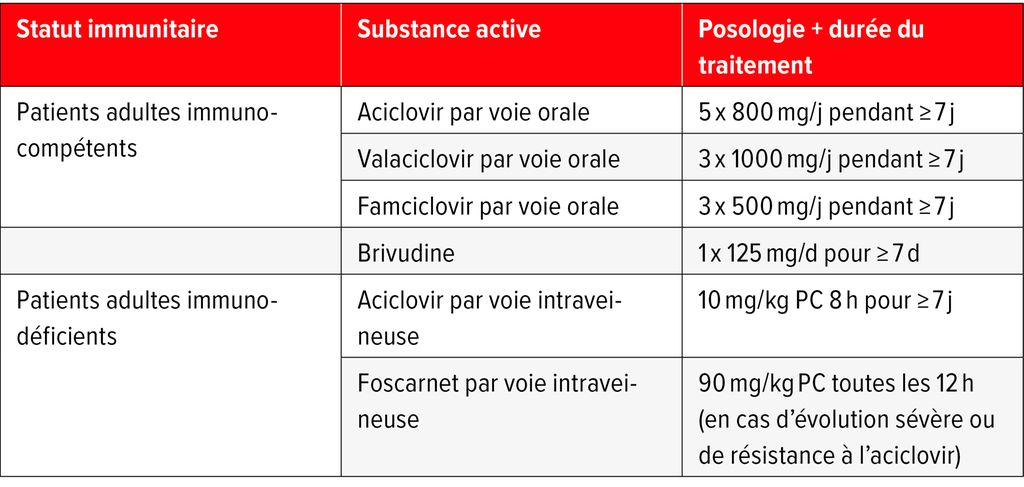 Outre les compresses froides et le traitement analgésique, ainsi que, le cas échéant, les antibiotiques topiques et les corticoïdes topiques et/ou systémiques, l’approche thérapeutique consiste avant tout à administrer le plus tôt possible (<72h) un traitement antiviral oral ou systémique (Tab.1).4