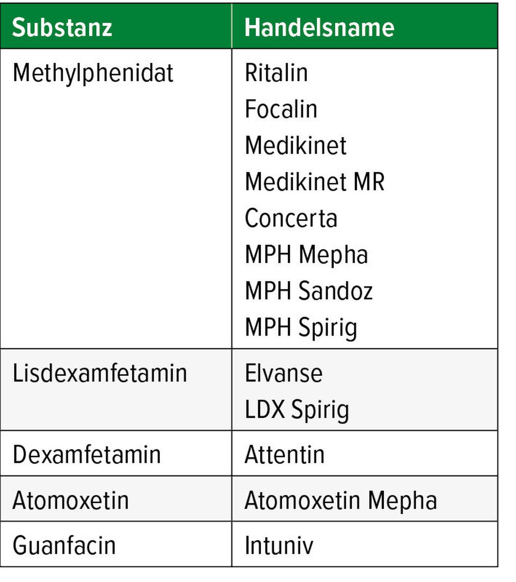 In der Pharmakotherapie der ADHS hat Methylphenidat (MPH) einen hohen Stellenwert und es sind verschiedene Präparate auf dem Markt. Am bekanntesten ist Ritalin, welches ab dem 6. Oktober 1954 eingeführt wurde. Als weitere Substanzen stehen Dexamfetamin und als Prodrug Lisdexamfetamin (LDX) zur Verfügung. Schliesslich kann noch mit Atomoxetin (ATX) oder Guanfacin behandelt werden (Tab. 1).