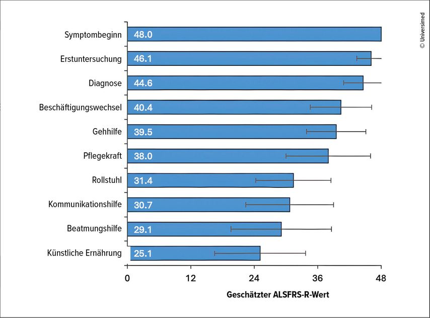 Abb. 1: ALSFRS-R-Werte für ausgewählte Krankheitsmeilensteine (modifiziert nach Mehdiyoun NF et al.)16