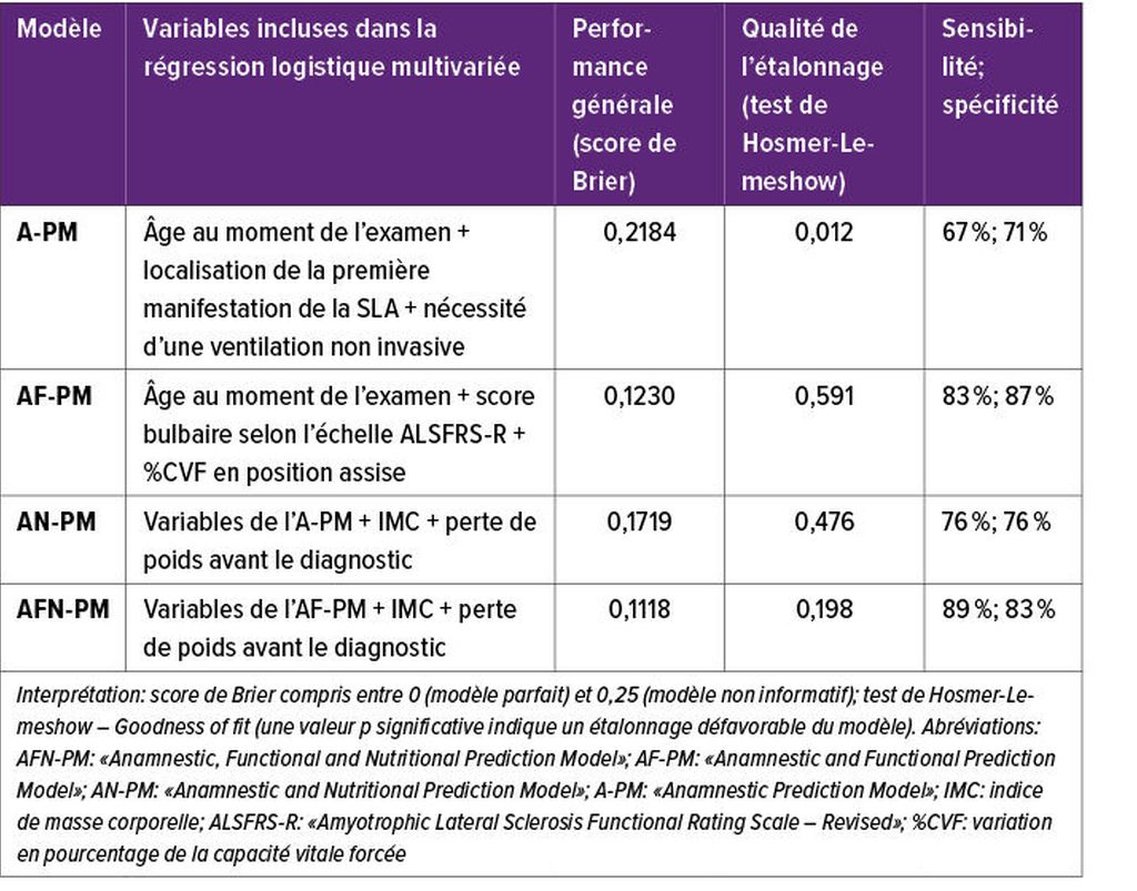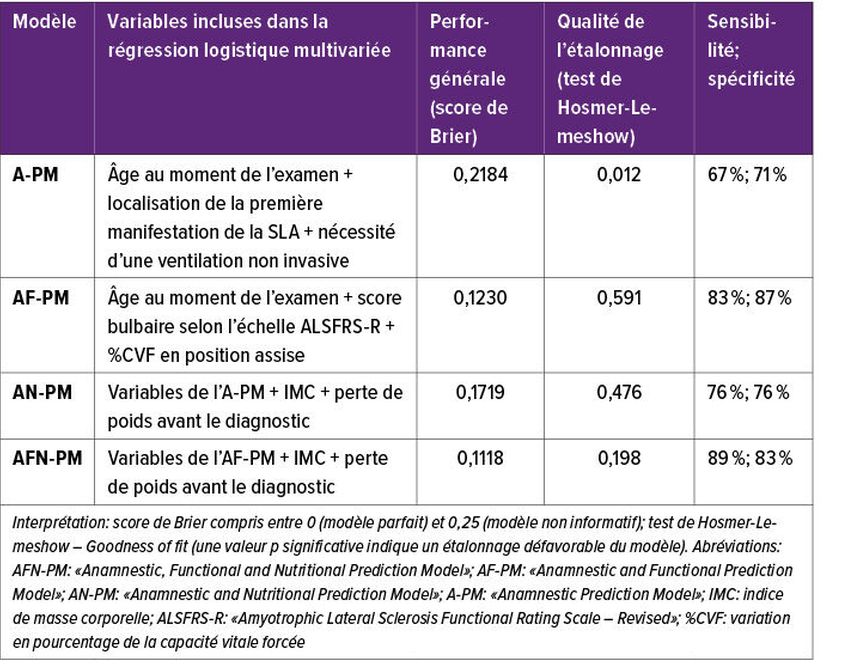 La GPE s’est établie dans la pratique clinique pour contrer la perte de poids involontaire, mais le moment optimal pour la mise en place reste sujet à débat.3 Dans ce contexte, Lizio et al. ont développé quatre modèles de régression logistique multivariée afin d’évaluer quelles caractéristiques anamnestiques et fonctionnelles des patient·es permettent de prédire la nécessité d’une GPE dans les six mois.4 Différents indices statistiques ont été calculés à partir d’une cohorte de développement rétrospective de 263 patient·es atteint·es de SLA. Ceux-ci comprenaient notamment le score de Brier pour évaluer la qualité des modèles5 ainsi que le test de Hosmer-Lemeshow pour évaluer la qualité de l’étalonnage des modèles6, la sensibilité et la spécificité permettant de déterminer la nécessité d’une GPE dans les six mois chez les participant·es.4
