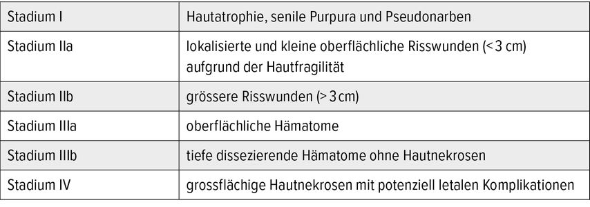 Bei der Entstehung spieltder Alterungsprozess eine zentrale Rolle: Hautalterung ist viel mehr als nur ein kosmetischer Aspekt, da hierbei die mechanische Schutzfunktion der Haut beeinträchtigt wird – mit teils schwerwiegenden Folgen für die Betroffenen. Hierfür prägte der Franzose Jean-Hilaire Saurat den Begriff Dermatoporose, der in einem ganzheitlichen Ansatz alle Aspekte dieses chronischen Hautinsuffizienz-/Fragilitätssyndroms erfassen soll.3 Dermatoporose wird in vier Stadien eingeteilt (siehe Tab. 1). Die kutane Alterung ist durch pigmentäre, vaskuläre, binde- und fettgewebige Aspekte gekennzeichnet, die zu diesem komplexen Prozess beitragen. Der Alterungsprozess ist genetisch bedingt, kann aber weitgehend durch Umweltfaktoren wie ultraviolette Strahlung, Luftverschmutzung und Rauchen beeinflusst werden.4