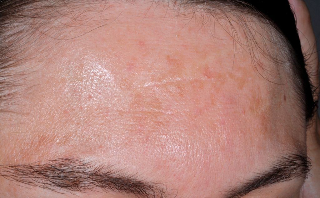 Das Melasma (auch Chloasma genannt) ist eine dunkelbraune Pigmentierung im Gesicht, häufig an der Stirne. Zu den Risikofaktoren gehören UV-Strahlung und hormonelle Faktoren, welche über die melanozytären Wachstumsfaktoren zur Aktivierung der epidermalen Melanozyten führen. Meist ist das Melasma nach der Schwangerschaft regredient. Bei Persistenz erweist sich eine Therapie als schwierig, nebst UV-Schutz könnten hydrochinonhaltige Externa oder Laser angewendet werden.