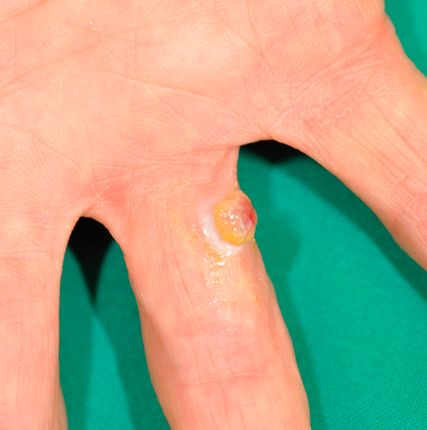Das GP, ein gutartiger Gefässtumor, der oft nach einem Bagatelltrauma auftritt und schnell blutet. Therapeutisch können eine (Shave-)Exzision oder eine Behandlung mit Tafelsalz versucht werden.
