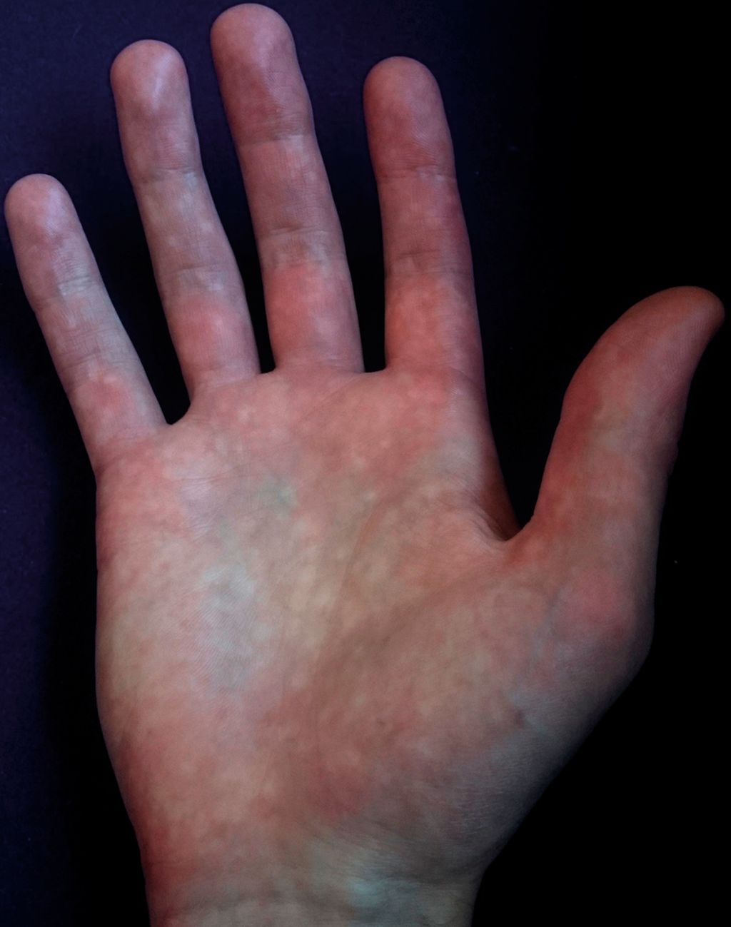 Bier-Spots (angiospastische Maculae, häufig an Beinen oder Armen; Abb. 4)