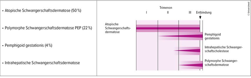 Die polymporphe Schwangerschaftsdermatose und das Pemphigoid gestationis können auch postpartal Symptome machen. Die atopische Schwangerschaftsdermatose und die intrahepatische Schwangerschaftsdermatose sind in der Regel nach Geburt nicht mehr klinisch manifest.