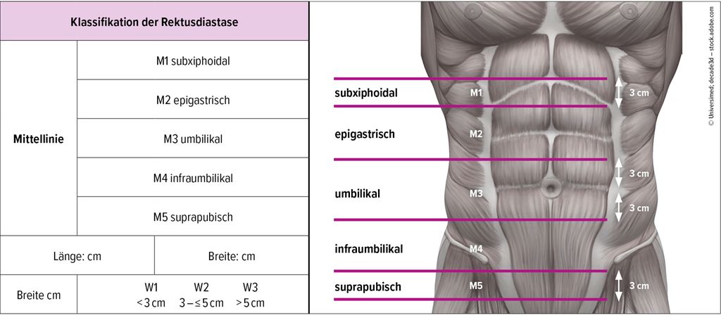 Als Rektusdiastase (RD) werden der Abstand der geraden Bauchmuskeln (M. rectus abdominis) über 2cm und das Ausdünnen der Linea alba bezeichnet.1 Die Deutsche Hernien Gesellschaft (DHG) und die International Endohernia Society (IEHS) empfehlen seit 2019, die Rektusdiastase einheitlich zu klassifizieren (Abb.1). Demnach wird ein Abstand von 2–3cm als W1, >3–5cm als W2 und über 5cm als W3 klassifiziert. Sehr grosse Diastasen werden nicht weiter unterschieden. Geschlecht, Hernien, vorangegangene Bauchoperationen, Anzahl der Schwangerschaften, Sectio oder vaginale Geburt, Hautqualität und Schmerzen werden berücksichtigt.1