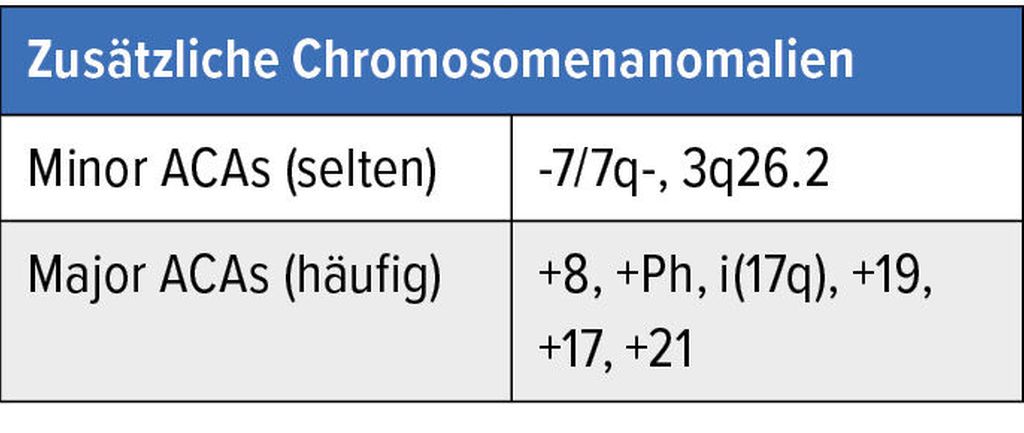 Das Auftreten von bestimmten zusätzlichen ACAs wird häufiger in der Blastenphase gesehen, in der chronischen Phase wird es als Risikosignal interpretiert.2,5–7