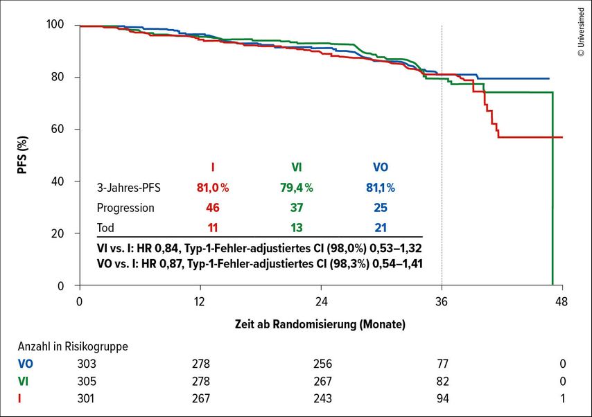 Die primäre Endpunktanalyse bestätigte die Nichtunterlegenheit der zeitlich begrenzten Konzepte gegenüber der Ibrutinib-Dauertherapie beim progressionsfreien Überleben (PFS) (Abb.1). Damit ist die Strategie der „fixed duration“ endgültig als mindestens gleichwertiger Standard validiert. Interessant ist hierbei der Blick auf die Tiefe der Remission: Die Kombination Venetoclax/Obinutuzumab erreichte mit 73,3% uMRD („undetectable minimal residual disease“) im peripheren Blut signifikant tiefere Ansprechraten im Vergleich zur rein oralen Kombination IV (47,2%) und, wenig überraschend, der Ibrutinib-Monotherapie (0%).1 Dies unterstreicht die hohe synergistische Potenz des CD20-Antikörpers im Kontext der BCL2-Inhibition.