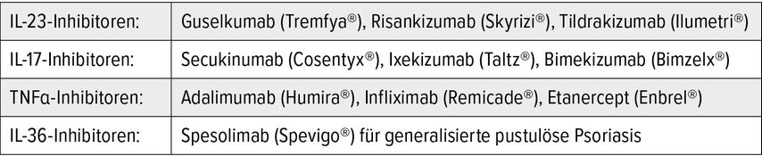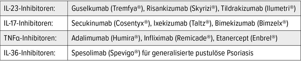 Zugelassen wurden zunächst die TNFα-Inhibitoren Etanercept (2004), Infliximab (2006) und Adalimumab (2007), von denen es auch Biosimilars gibt. 2009 kam mit Ustekinumab der erste Interleukin(IL)-12/23-Inhibitor hinzu, 2016 mit Secukinumab der IL-17-Hemmer und das Small Molecule Apremilast und 2018 der IL-23-Blocker Guselkumab. In den folgenden Jahren wurden dann noch weitere Medikamente aus diesen Stoffgruppen bewilligt.
