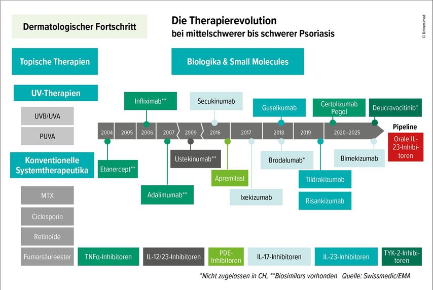 1 Skayem C et al.: Epidemiology of psoriasis: a worldwide global study. Acta Derm Venereol 2025; 105: adv42945 2 Maul JT et al.: Gender and age significantly determine patient needs and treatment goals in psoriasis - a lesson for practice. J Eur Acad Dermatol Venereol 2019; 33(4): 700-8 3 Nast A et al.: EuroGuiDerm guideline on the systemic treatment of psoriasis vulgaris - part 1: treatment and monitoring recommendations. J Eur Acad Dermatol Venereol 2020; 34(11): 2461-98 4 Nast A et al.: EuroGuiDerm guideline on the systemic treatment of psoriasis vulgaris - part 2: specific clinical and comorbid situations. J Eur Acad Dermatol Venereol 2021; 35(2): 281-317 5 Nast A et al.: German S3-guideline on the treatment of psoriasis vulgaris, adapted from EuroGuiDerm - part 1: treatment goals and treatment recommendations. J Dtsch Dermatol Ges 2021; 19(6): 934-150 6 www.spezialitaetenliste.ch ; zuletzt aufgerufen am 16. 9. 2025 7 www.guidelines.edf.one/guidelines/psoriasis-guideline ; zuletzt aufgerufen am 16. 9. 2025 8 Reich K et al.: Cardiovascular safety of ustekinumab in patients with moderate to severe psoriasis: results of integrated analyses of data from phase II and III clinical studies. Br J Dermatol 2011; 164(4): 862-72 9 Papp KA et al.: Long-term safety of ustekinumab in patients with moderate-to-severe psoriasis: final results from 5 years of follow-up. Br J Dermatol 2013; 168(4): 844-54 10 Rungapiromnan W et al.: Impact of biologic therapies on risk of major adverse cardiovascular events in patients with psoriasis: systematic review and meta-analysis of randomized controlled trials. Br J Dermatol 2017; 176(4): 890-901 11 Champs B et al.: Short-term risk of major adverse cardiovascular events or congestive heart failure in patients with psoriatic arthritis or psoriasis initiating ambiological therapy: a meta–analysis of randomised controlled trials. RMD open 2019; 5: e000763 12 Pinter A et al.: Comparative effectiveness of biologics in clinical practice: week 12 primary outcomes from an international observational psoriasis study of health outcomes (PSoHO). J Eur Acad Dermatol Venereol 2022; 36(11): 2087-100 13 Pinter A et al.: Comparative effectiveness and durability of biologics in clinical practice: month 12 outcomes from the International, Observational Psoriasis Study of Health Outcomes (PSoHO). Dermatol Ther (Heidelb) 2024; 14(6): 1479-93 14 Song EJ et al.: Safety and efficacy of risankizumab in genital and scalp psoriasis in the UnlIMMited phase 4 randomized clinical trial at week 16. Abstract #LB1149; präsentiert auf dem Jahreskongress der Society for Investigative Dermatology, 7-10. Mai 2025, San Diego, California https://sidannualmeeting.org/wp-content/uploads/2025/05/SID_SanDiego_2025_Abstracts_-05-06-25.pdf ; zuletzt aufgerufen am 16. 9. 2025 15 Gooderham MJ et al.: Phase 3 results from an innovative trial design of treating plaque psoriasis involving difficult-to-treat, high-impact sites with icotrokinra, a targeted oral peptide that selectively inhibits the IL-23–receptor. Abstract #LB1142; präsentiert auf dem Jahreskongress der Society for Investigative Dermatology, 7-10. Mai 2025, San Diego, California https://sidannualmeeting.org/wp-content/uploads/2025/05/SID_SanDiego_2025_Abstracts_-05-06-25.pdf ; zuletzt aufgerufen am 16. 9. 2025 16 Mrowietz U et al.: Patient-reported well-being in value-based routine care using tildrakizumab: 52-week interim data of the phase IV positive study. Psoriasis (Auckl) 2025; 15: 243-59 17 https://cdn.who.int/media/docs/default-source/mental-health/five-well-being-index-(who-5)/who-5_german.pdf?sfvrsn=fce836c0_3 ; zuletzt aufgerufen am 16. 9. 2025 18 Prajapati VH et al.: Guselkumab for the treatment of moderate-to-severe plaque psoriasis in paediatric patients: results of the phase III randomized placebo-controlled PROTOSTAR study. Br J Dermatol 2025; 192(4): 618-28 19 Renkhold L et al.: Secukinumab reduces psoriasis-associated pruritus and regenerates the cutaneous nerve architecture: results from PSORITUS, a doubleblind, placebo-controlled, randomized withdrawal phase IIIb study. Acta Derm Venereol 2024; 104: adv40737 20 Armstrong AW et al.: Safety and efficacy of deucravacitinib in moderate to severe plaque psoriasis for up to 3 years. An open-label extension of randomized clinical trials. JAMA Dermatol 2025; 161(1): 56-66 21 Bachelez H et al.: Trial of spesolimab for generalized pustular psoriasis. N Engl J Med 2021; 385(26): 2431-40 22 Persönliche Mitteilung: https://www.swissmedic.ch/swissmedic/de/home.html