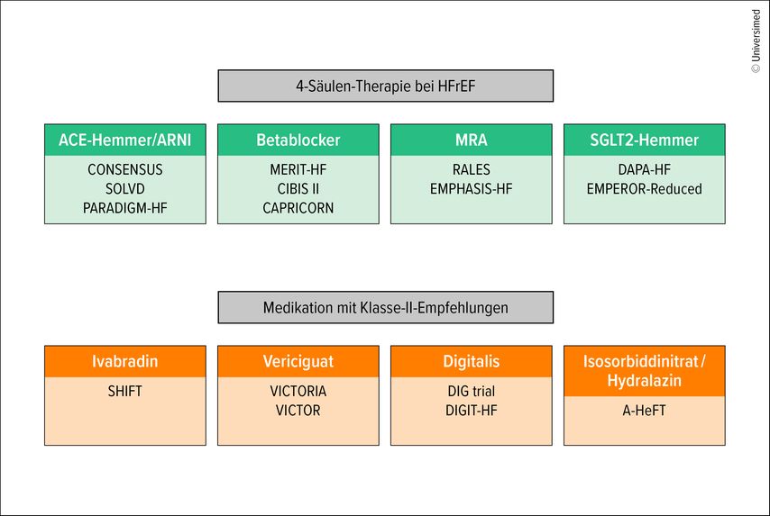 Historisch entwickelte sich die heutige evidenzbasierte HFrEF-Therapie schrittweise: Zunächst wurden ACE-Hemmer eingeführt (CONSENSUS, SOLVD), gefolgt von Betablockern (CIBIS-II, MERIT-HF, CAPRICORN), Mineralokortikoidrezeptorantagonisten (MRA; RALES, EMPHASIS-HF), Angiotensin-Neprilysin-Inhibitoren (ARNI; PARADIGM-HF) und schließlich Sodium-Glukose-Cotransporter-2-Inhibitoren (SGLT2-Inhibitoren; DAPA-HF, EMPEROR-Reduced). Diese vier Substanzklassen bilden heute die Basis jeder leitliniengerechten Therapie der HFrEF und sind in der klinischen Routine angekommen.1