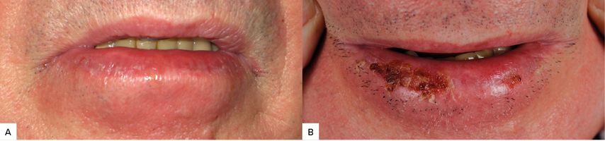 Unter histologischer Betrachtung zeigt die AC Atypie und Verlust der Polarität der Keratinozyten, ein chronisches entzündliches Infiltrat und Elastose im Bindegewebe aufgrund basophiler Degeneration der extrazellulären Matrix (solare Elastose). In fortgeschrittenen Fällen können auch dysplastische Veränderungen beobachtet werden.10 Der Prozess der malignen Umwandlung der aktinischen Cheilitis in ein invasives Plattenepithelkarzinom der Lippenhaut verläuft üblicherweise sehr langsam, dieser Vorgang dauertetwa 1–30 Jahre.10 Die Häufigkeit der malignen Transformation variiert zwischen 10% und 30%,11,12 jedoch wird berichtet, dass 95% der SCC der Unterlippe auf einer bereits vorhandenen AC entstehen. Das SCC der Lippenhaut ist aggressiver als das SCC der restlichen Haut und weist eine viermal höhere Metastasierungsrate auf.12,13