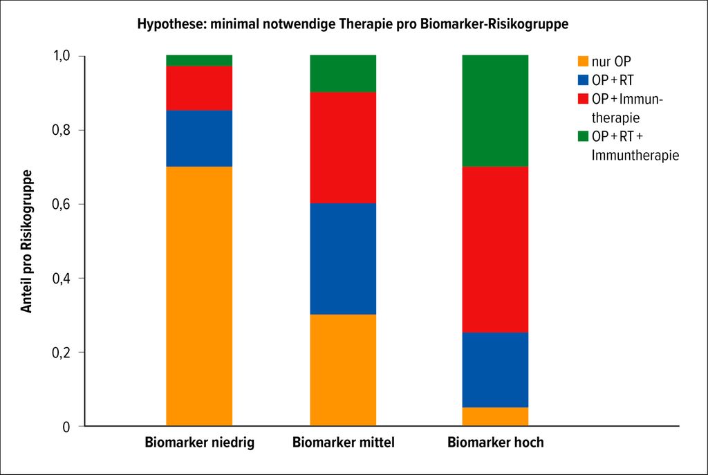 Die Zukunft der adjuvanten Therapie liegt in multimodalen Konzepten. Die Rolle der adjuvanten Strahlentherapie in Zusammenhang mit modernen Systemtherapien könnte durch randomisierte Studien besser geklärt werden, was die Teilnahme vieler Zentren erfordert. Essenziell ist die Entwicklung starker personalisierter Therapiestrategien, um eine Überbehandlung bestimmter Patient:innengruppen durch die multimodale Therapie zu vermeiden und den Patient:innen mit besonders hohem Risiko für einen Tumorprogress eine optimale Therapie zukommen zu lassen (Abb.1 als hypothetisches Beispiel). Gleichzeitig müssen hier gezielt Aspekte der Kosteneffizienz mit untersucht werden.