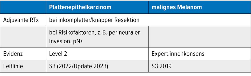 Zur adjuvanten Bestrahlung beim Plattenepithelkarzinom fehlen randomisiert-kontrollierte Studien. Retrospektive Analysen deuten Vorteile in Hochrisikosubgruppen an, etwa bei perineuraler Invasion oder nodalem Befall, zum Beispiel in einer Studie von Harris et al.2 Metaanalysen zeigen sogar Überlebensvorteile für solche Patient:innengruppen.3,4 Insgesamt basiert die Evidenz bisher auf Level-II-Daten und unterstützt neben der Strahlentherapie nach inkompletter oder knapper Resektion auch die adjuvante Strahlentherapie bei Patient:innen mit Risikofaktoren wie oben genannt (Tab.1).