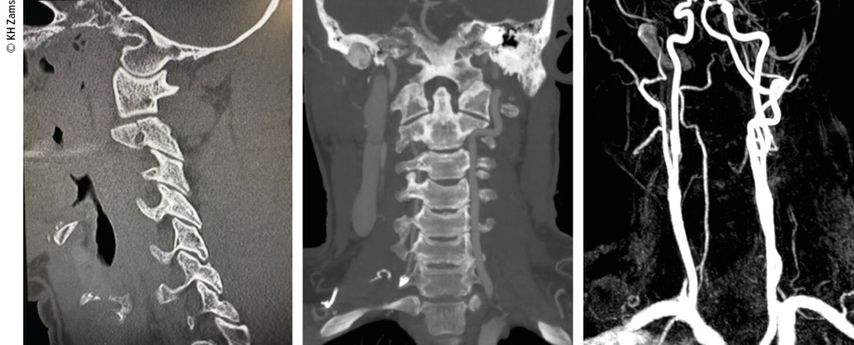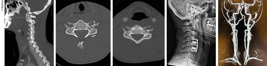 Der interdisziplinäre Ansatz ist entscheidend. Liegt beispielsweise eine instabile HWS-Verletzung mit Vertebralis-Dissektion vor, so ist die Wiederherstellung stabiler Verhältnisse für u.a. die A. vertebralis vordergründig (Abb.2–4). Dieser operative Eingriff erfolgt bereits unter therapeutischer Heparinisierung. Je nach Ausmaß der Gefäßverletzung wird dabei ein- oder zweizeitig die endovaskuläre/offene Therapie zur Gefäßreperfusion durchgeführt. Aktuelle interdisziplinäre Therapieempfehlungen: