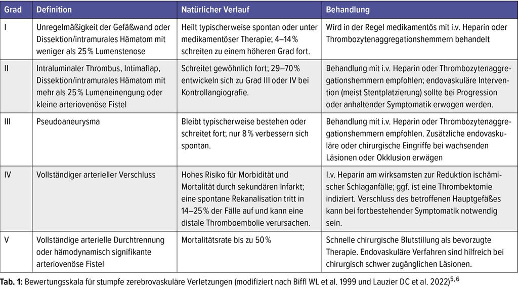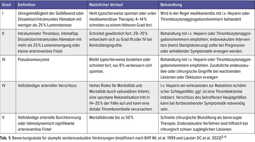 Tab. 1: Bewertungsskala für stumpfe zerebrovaskuläre Verletzungen (modifiziert nach Biffl WL et al. 1999 und Lauzier DC et al. 2022)5,6