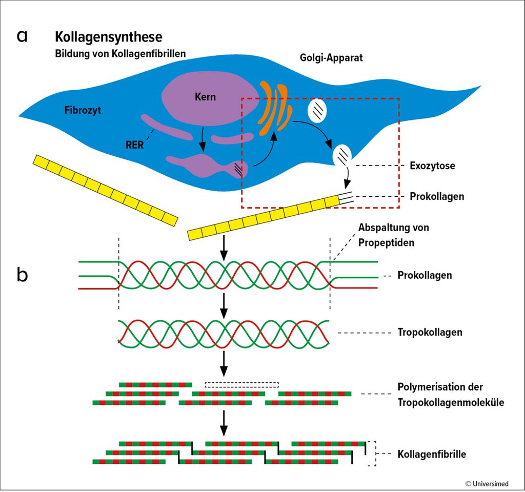 Da Kollagen ein Protein ist, besteht es aus Aminosäuren und besitzt eine typische Dreifachhelixkonfiguration, die aus jeweils drei Polypeptid-alpha-Ketten zusammengesetzt ist. Ein Kollagenpeptid kann aus bis zu 6000 Aminosäuren aufgebaut sein und stellt somit ein riesiges Molekül dar. Die Aminosäurenzusammensetzung folgt dem Schema G-X-Y und wiederholt sich ständig. Die Stelle G ist immer mit Glycin besetzt, an Stelle X findet sich meist Prolin und an der Stelle Y sieht man häufig ein Hydroxyprolin. Außerdem kommt die Aminosäure Lysin in hydroxylierter Form oft in den Peptidketten des Kollagens vor. Um das sogenannte Tropokollagen, das nach Abspaltung der Peptidenden des Prokollagens außerhalb der synthetisierenden Zelle entsteht, zu erhalten, werden jeweils drei Kollagenpeptide, die selbst schraubenförmig verdreht vorliegen, ineinander zu einer Helix verdrillt. Mehrere Tropokollagenelemente lagern sich dann zu Kollagenfibrillen zusammen und bilden schließlich dicke Kollagenfasern. Kollagenfibrillen können sich, je nach Funktion, parallel oder flächig ausrichten. Kollagenfasern werden durch die Ausbildung von Wasserstoffbrücken stabilisiert und leicht zueinander versetzt angeordnet.