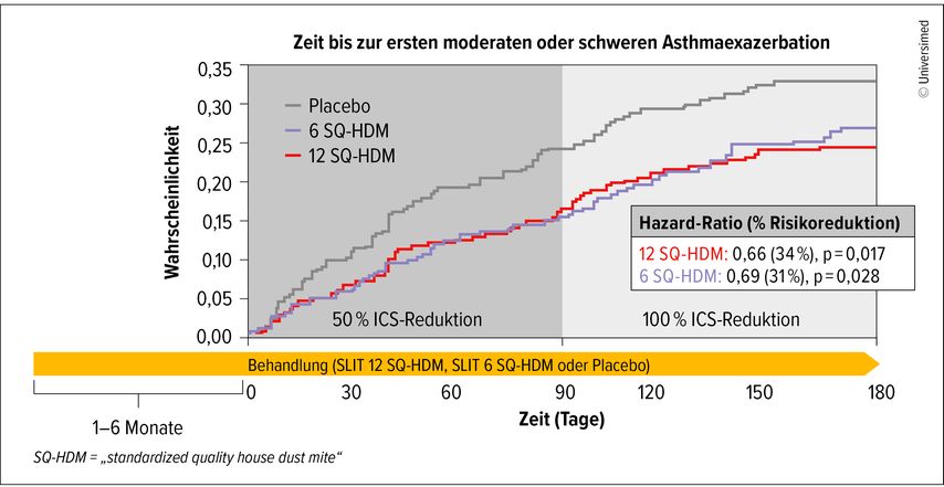Primärer Endpunkt war die Zeit bis zur ersten moderaten oder schweren Exazerbation während dieser Reduktions- bzw. Absetzphase. Sekundäre Endpunkte waren Verschlechterung der Asthmasymptome, Veränderung des allergenspezifischen Immunoglobulin G4 (IgG4), Veränderungen in Scores zur Asthmakontrolle und Lebensqualität sowie unerwünschte Ereignisse. Die Studie zeigte in den beiden Verumarmen signifikante Reduktionen des Exazerbationsrisikos in der Größenordnung von 30% (Abb.1). Im Vergleich zu Placebo zeigten sich auch eine Reduktion von Exazerbationen mit Asthmaverschlechterung sowie ein signifikanter Anstieg des allergenspezifischen IgG4. Die Überlegenheit der SLIT zeigte sich sowohl in der Phase der Studie, in der die Patient:innen mit einer reduzierten ICS-Dosis behandelt wurden, als auch in der letzten Phase, in der sie keinerlei Erhaltungstherapie bekamen. In den beiden SLIT-Armen war auch der Reliever-Gebrauch signifikant niedriger. Auch das Risiko für eine Verschlechterung der Lungenfunktion war in den beiden Verumgruppen niedriger als in der Placebogruppe. Eine klare Dosis-Wirkungs-Beziehung zugunsten der höheren Dosierung zeigte sich in der Verhinderung schwerer Exazerbationen, die insbesondere bei vollständigem Absetzen der ICS mit der niedrigeren SLIT-Dosis ähnlich häufig auftraten wie unter Placebo. Auch die Rhinitis-bezogenen Endpunkte wurden mit beiden SLIT-Dosierungen erreicht. Die Behandlung wurde gut vertragen, es kam zu keinen schweren allergischen Reaktionen.7