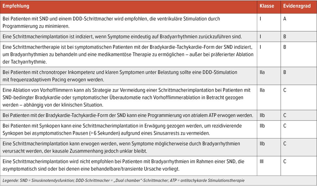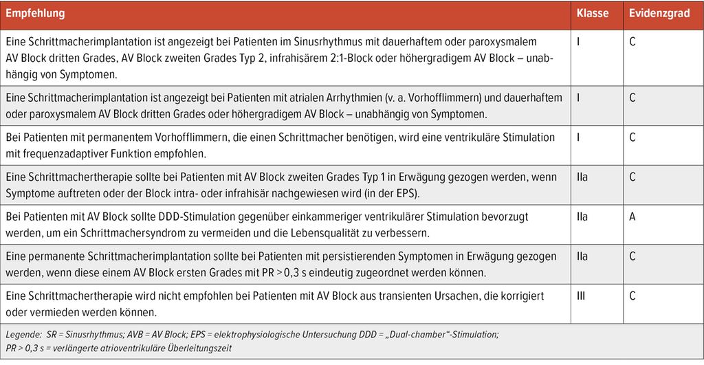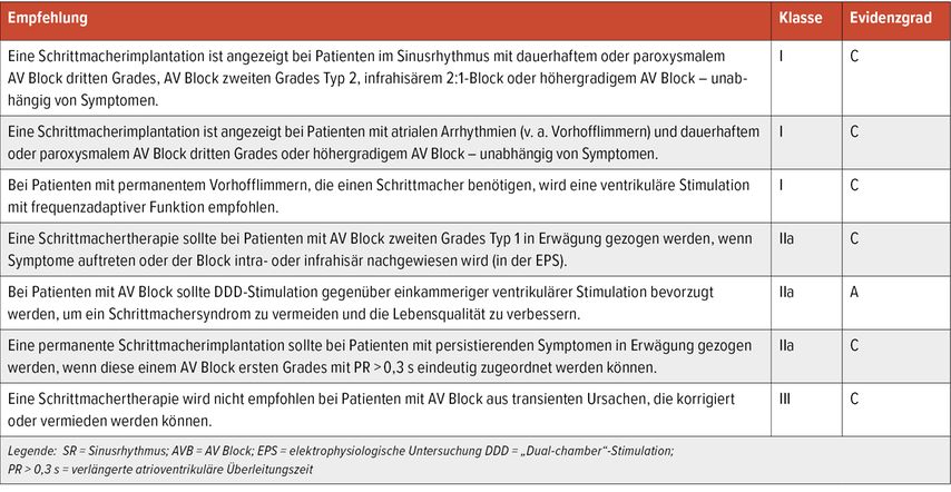 Je nach kardialer Pathologie geben die ESC-Leitlinien über Indikation, Empfehlungsgrad und Art der Schrittmachertherapie Aufschluss.