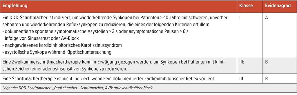 Patienten mit rezidivierenden Synkopen stellen oft eine Herausforderung dar. Eine Klasse-I-Indikation für einen Herzschrittmacher besteht bei Patienten über 40 Jahre mit schweren, rezidivierenden Synkopen mit symptomatischen Pausen >3 Sekunden oder asymptomatischen Pausen >6 Sekunden, aber auch bei Asystolien mit Synkopen im Rahmen einer Kipptischuntersuchung (Tab. 3).