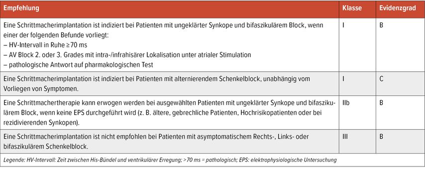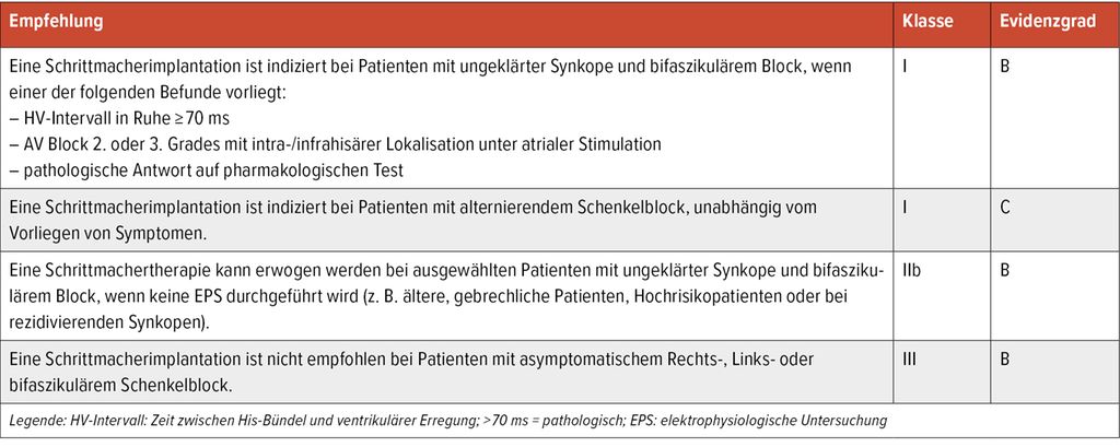 Patienten mit bifaszikulärem Block (z.B. Rechtsschenkelblock + linksanteriorem/linksposteriorem Hemiblock) und ungeklärter Synkope sind klinisch eine Herausforderung. Die ESC-Leitlinien klassifizieren diese Situation als Klasse-I-Indikation, insbesondere wenn ein infranodaler Block wahrscheinlich ist (Tab. 4). Eine invasive elektrophysiologische Diagnostik oder intermittierende Rhythmusüberwachung (z.B. mittels „looprecorder“) ist sinnvoll, um die prognostisch relevante Erregungsleitungsstörung zu belegen.