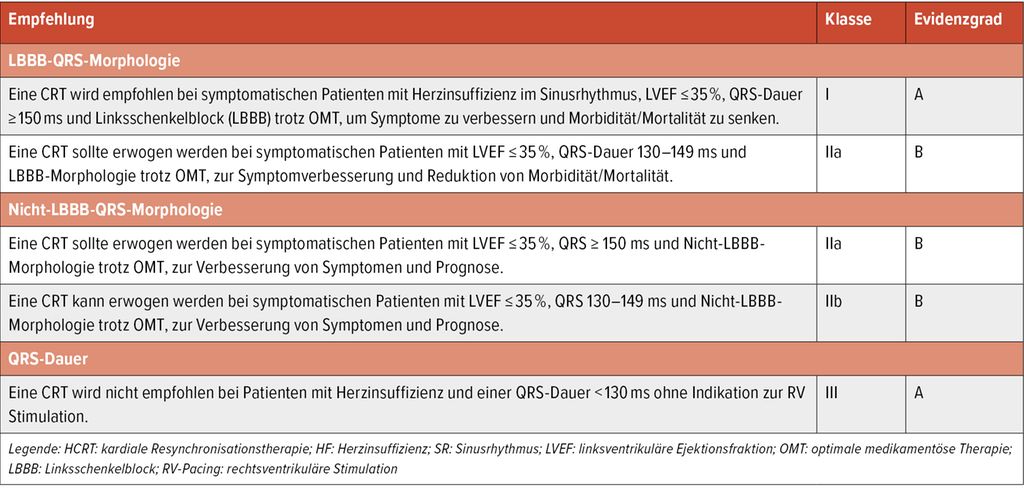 Für Patienten mit reduzierter linksventrikulärer Pumpleistung ≤35% im Sinusrhythmus, mit einer QRS-Dauer >150ms und Linksschenkelblock (LSB) trotz optimierter medikamentöser Therapie wirddie CRT-Implantation als Klasse-I-Indikation in den ESC-Leitlinien angeführt (Tab. 5). Eine physiologische Stimulation des Reizleitungssystems (His-Bündel-, „left bundlebranch[LBB]pacing“), im Rahmen eines höhergradigen AVBlocks oder als Alternative nach frustraner Implantation einer linksventrikulären Elektrode, sollte in diesem Setting bevorzugt werden (Abb. 1).